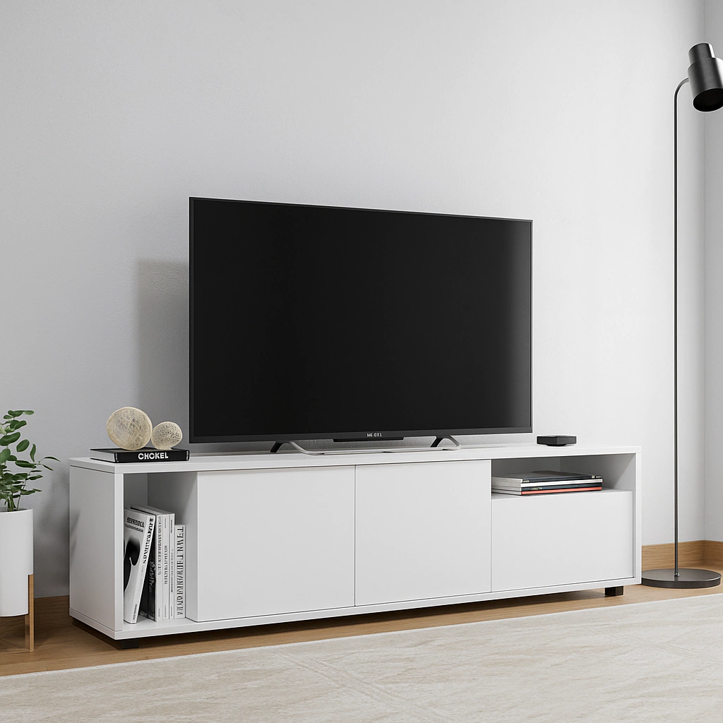 Rack para tv contemporáneo, puede usarse apoyado o podés colgarlo! Tiene un buen espacio dealmacenaje, con espacios abiertos y espacios cerrados con puertas para proteger tus cosas del polvo. El sistema de apertura de las mismas es push open. Su diseño es moderno con lineas puras. Praga es un diseño exclusivo de KiLab home.